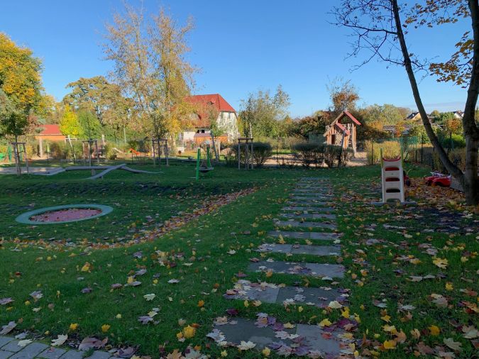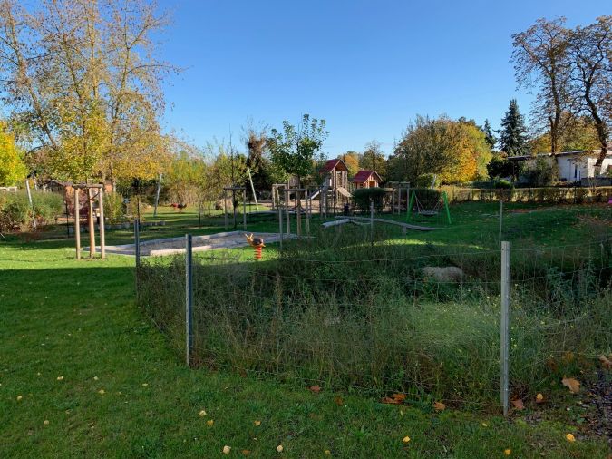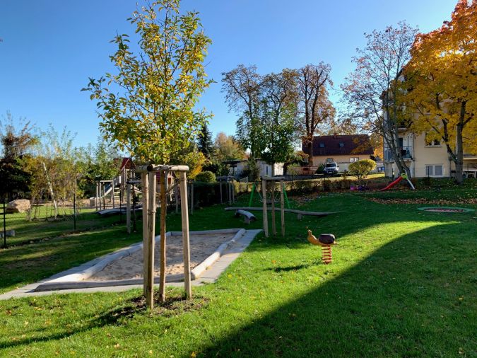 Der 1.300 m² große Garten- und Hofbereich bietet großzügige, gemeinschaftliche Frei- und Spielflächen für die Bewohner.