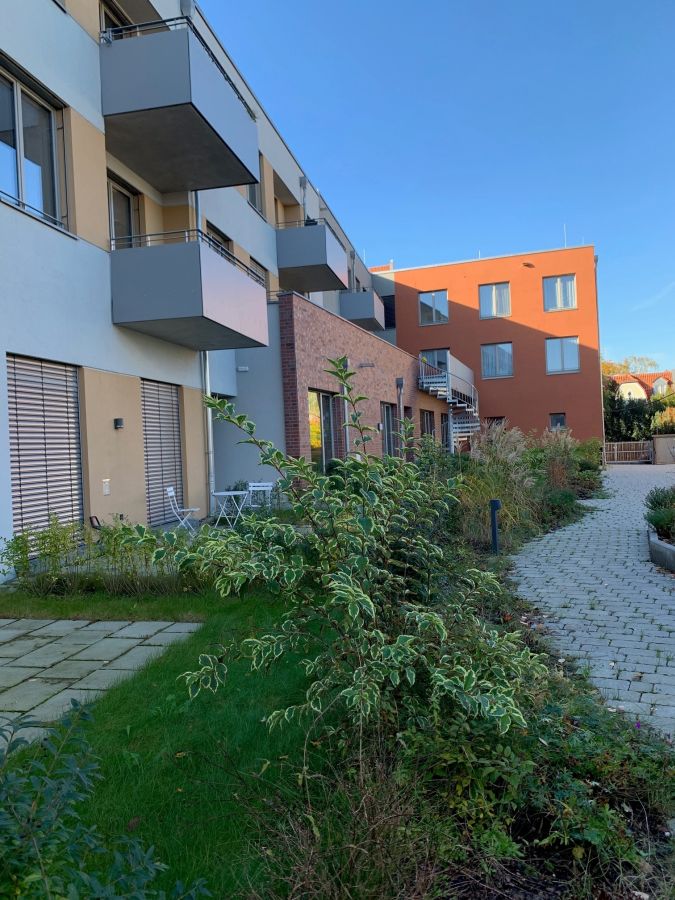 In der 3 - geschossigen Blockrandbebauung und einem rückwärtig gelegenen Gebäude im Garten sind 19 Wohneinheiten sowie 4 Atelier- und Gewerbeeinheiten und eine Kita vorgesehen. Auch eine Frauenarztpraxi ist in das Konzept integriert.