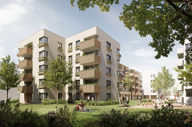 Das Quartier verfügt über eine Tiefgarage mit Auto- und Fahrradabstellplätzen (mindestens 2 Fahrradstellplätze pro Wohnung) sowie individuelle Kellerräume. Sämtliche Wohnungen und Gemeinschaftsflächen sind barrierefrei erreichbar.